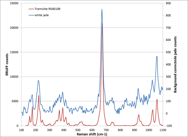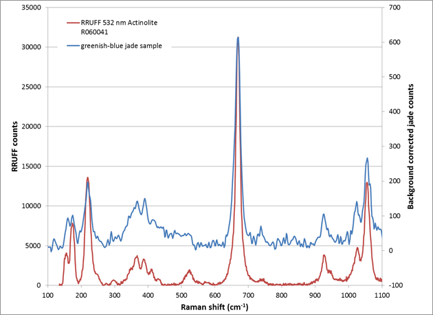 Raman spectrum of greenish-blue jade sample excited with 532 nm laser, plotted with actinolite spectrum from RRUFF database.